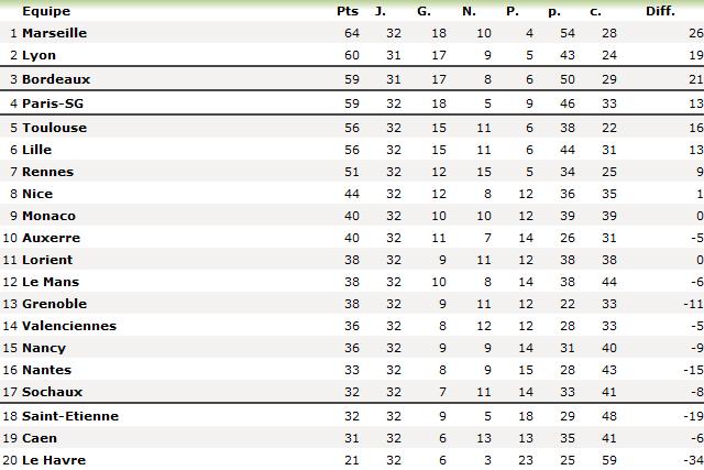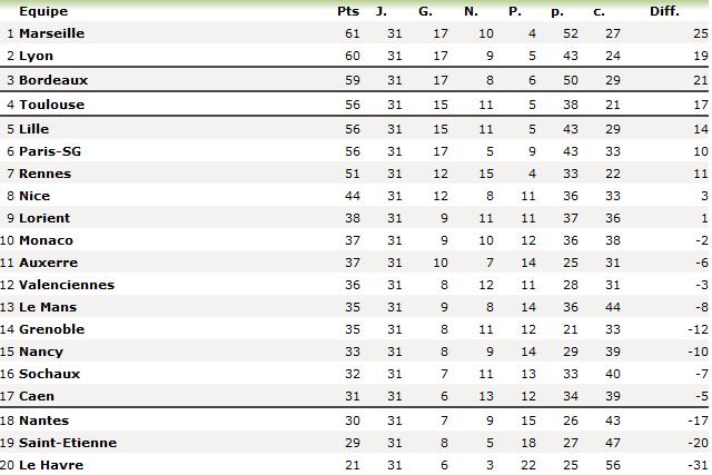 Le calendrier est plutot a l'avantage de Bordeaux et le pire est celui de Lyon qui lui reste toute les equipes de tête a jouer
