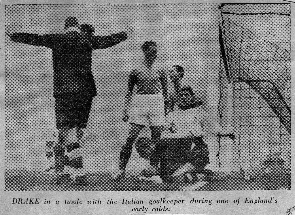 CitationUn match qui restera longtemps dans l'histoire d'Arsenal. Nous sommes en novembre 1934, l'Italie championne de monde viens pour jouer un match amicale contre l'Angleterre. Malheureusement il y a beaucoup de tension. Le dictateur italien Benito Mussolini envoie une télégramme à ses joueurs avant le match \"Pour que votre pays gagne!\" Pour la première fois une équipe nationale, l'Angleterre, aligne sept joueurs d'une même équipe (Arsenal):Ted Drake, Frank Moss, George Male, Eddie Hapgood, Wilf Copping, Ray Bowden et Cliff Bastin.Pour Ted Drake l'attitude agressive des italiens venait de la pression du télégramme de Mussolini. Frank Moss le gardien étais blessé à l'épaule, il continuait à jouer avec son nez cassé, tous les joueurs anglais portent des coups en souvenir de ce match. Aprés seulement 15 minutes l'Angleterre mène 3-0 avec des buts de Drake et Eric Brooke (2buts). Ensuite des italiens complètement dépassés jouent plus en plus physique. Les anglais jamais dernier dans ce domaine laisse le défenseur centrale Monti avec un orteils cassé après 20 minutes de jeu. Des duels de Drake sur le gardien italien mène à une situation où encerclé par 4 défenseurs italiens, l'un d'eux essaie de l'étrangler. Le match a fini sur le score de 3-2. Ce match a démontré deux choses très importante: qu'a ce moment là, l'équipe d'Arsenal de Chapman est tout simplement la meilleure au monde bien avant les soi disant grandes équipes comme Barcelone, Real Madrid ou AC Milan. Malheureusement les coupes des Europe n 'existaient pas à cette époque. Deuxièmement que les Anglais étaient vraiment idiots de ne pas participer aux coupes de mondes.