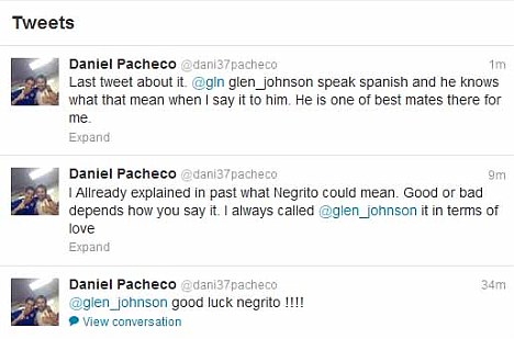 le message de Daniel Pacheco, le jeune attaquant de Liverpool a son coequipier Glen Johnson fait parler de lui (surtout apres l'affaire Suarez) . Il a twitte : '' Bonne Chance Negrito!!''