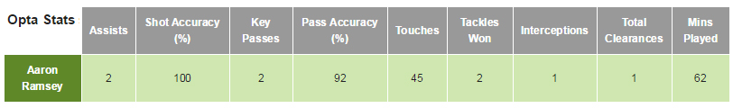 N''empêche quand on voit ce qu'il a apporté côté droit, et qu'on compare avec l'activité d'un Walcott, je sais pas si on aurait fait le même match avec l'anglais. On sacrifie un peu Ramsey parce que c'est pas son poste, mais dans bien des domaines on est peut-être gagnant. Il a touché beaucoup de ballon, avec toujours la même activité et 92% de passes réussies, sans compter le travail défensif.