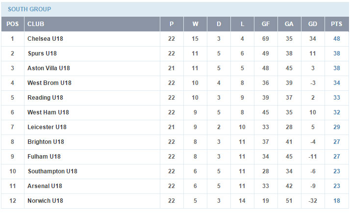Donc Arsenal U18 a finit 6ème sur 12 de la division sud. Puis il y avait une sorte de nouveau championnat playoff entre le nord et le sud. Et dans son groupe, Arsenal est 5ème sur 8 à 1 journée de la fin (ils rencontreront Tottenham le 30 Avril).