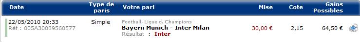 Mouai, c'est aussi louche la suspension de Ribéry faut le dire franchement. Le geste était là, mais 3 matchs c'est énorme comme suspension!! Peut-être une conspiration des italiens qui voulaient qu'un italien gagne la LDC et qu'il ont gardé leur 4 places pour la saison 2011 alors qu'elle devait revenir à l'Allemagne, dommage!!