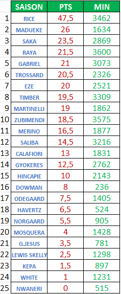 Citation de: we are the Arsenal ! le Aujourd'hui à 12:12:17On peut dire la même chose de Saka cette saison devenu le plus gros salaire du club. La saison d'Havertz a été perturbé par une grosse blessure, saka n'a même pas cette excuse...Saka a eu plusieurs petits blessures,mais s'il faut poser la question lequel a apporté plus à l'équipe il n'y a pas de photo entre les deux.